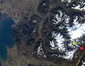 Image of project on Mount Baker as seen from space: red dot is powerhouse, green dot is dam(s). Bellingham on the upper left side of frame, Lake Shannon on lower right.