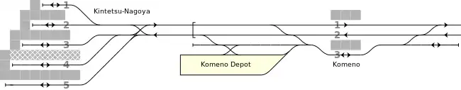 Komeno Station has a side platform and an island platform serving three tracks on the ground, and the entrance is located in the north of Nagoya-bound platform, connecting to Kuwana-bound one with a level crossing. Track 3 is not for embarking or disembarking passengers but for chartered trains, deadhead trains and trains entering or leaving Tomiyoshi Inspection Komeno Branch Depot.