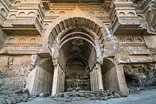 The roof is panelled in imitation of a structural hall with beams 19 inches deep by 8 thick, 3.5 feet apart, running across through the heads of the pillars, and the spaces between divided by smaller false rafters, 5 inches broad by 2 deep. There are three wide doors into the hall, though most of the front wall is broken away, and on each side six cells in all, each with the monk's bed in it, and the first on each side with two. Over the doors of 14 of these cells are carved Chaitya or horse-shoe arches, connected by a string course projecting 6 or 7 inches and carved with the rail pattern.[3]