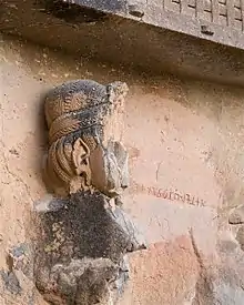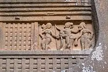 There are still, however, remains of seven pillars on the left side of the cave, and six on the south, which rake inwards, as do also those at Bhaja and Bedsa, a proof of the early date of the work; those behind the dagoba and six near the front on the right side have disappeared entirely. On the upper portion of one column on the left is a symbol or device somewhat resembling a dagoba, with a rude canopy over it. The arched roof has had wooden rafters as at Karle and elsewhere, but they are gone, and the only remains of the woodwork is a portion of the latticed screen in the front arch. The façade bears a strong family likeness to that at Bhaja. On the left side is a fragment of sculpture in high-relief part of the head of a single figure about twice life-size. The features are destroyed, but the details of the headdress show the most careful attention to finish of detail. Over the left shoulder is an inscription in one line in Brahmi characters which reads: Kanvasa antevasina Balakena katam ("Made by Balakena, the pupil of Kanha (Krishna)").[3]