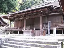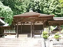 Most notable among them is the Mie Hall, an Important Cultural Property rebuilt in 1606. It is a 4×4 structure with tented roof covered with hinoki cypress shingles, a 1 ken step canopy at the front and a 2 ken step canopy at the back. There is a moon viewing stage under a karahafu gable attached to the eastern side of the hall, while the west is connected to the image hall.[13]