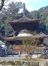 In front of the main hall, there is a 3 ken treasure pagoda (tahōtō) (4). Originally built during the Heian period, 1086–1184, it is the temple's oldest structure, although it has been restored considerably in 1606–1607. It is roofed in cedar wood shingles. The 3×2 ken bell tower, or shōrō behind the main hall dates to the Kamakura period. It has a flared skirt like lower part (袴腰, hakamagoshi)[12] and an irimoya style[ex 1] hongawarabuki roof.[ex 2]