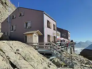 The Konkordia Hut (German: Konkordiahütte) is a mountain hut of the Swiss Alpine Club, located north of Fieschertal in the canton of Valais. The hut lies above Konkordiaplatz, the point of convergence of several glaciers in the great Aletsch Glacier system of the Bernese Alps. It is located at a height of 2,850 metres above sea level, at the foot of the Fülbärg.