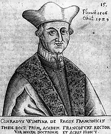 Konrad Wimpina (Wiminae, Wiminesis; real name Konrad Koch) (b. at Buchen in Baden, about 1465; d. at Amorbach in Lower Franconia, 17 May 1531) was a German Roman Catholic theologian and humanist of the early Reformation period. He was a conservative, considered quiet but somewhat narrow. In theology he was a pupil of Martin Polich of Mellerstadt and a Thomist.