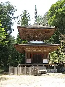 In 1298, Emperor Fushimi visited this temple the existing Tahōtō pagoda was built at his request. An inscription on the fushibachi (a component shaped like an upside down bowl on the roof) confirms this date.The building was repaired in 1490 and 1691. This structure is an Important Cultural Property (ICP),[3] as is a stone Hōkyōintō pagoda from the late Kamakura period.[4] The wooden statue of a seated Miroku Bosatsu that is the honzon of the temple also dates from the Kamakura period and is a National Important Cultural Property;[5] however, it is now stored in the treasury of Daigo-ji for safekeeping.[2]