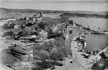 View from Oslo City Hall. The restaurant Skansen (left) was built at Kontraskjæret in 1927.