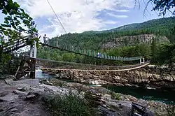 The Kootenai Falls Swinging Bridge, known to locals as just the Swinging Bridge, is a simple suspension footbridge that crosses the Kootenai River just downstream of Kootenai Falls. The bridge was first constructed by the Civilian Conservation Corps during the Great Depression,[3][4] allowing the US Forest Service to better facilitate firefighter access to the forested mountains just north of the river.[2] The bridge is open to the public and offers visitors elevated views of Kootenai Falls.