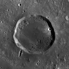 At one time this crater was considered to have formed due to volcanic activity,[1] in contrast to most lunar craters which are considered to have been created through impacts. However it is more likely that the crater was formed by an impact against a surface that was still partly molten. This has left the crater with a sharp-edged, circular rim and a flat, dark-hued interior floor. Indeed, the albedo of the interior floor matches that of the lunar mare to the west. The southeast part of the floor is fractured with a series of narrow rilles. The floor along the northwest and northeast edges is more rugged, and these sections have escaped the lava that covered the remainder of the floor.