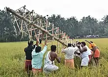 The rituals are observed during ploughing of the land are known as 'kandada kori'[2] in Tulu Language. Before sowing is undertaken, it's a custom to place a pillar (known as 'pookare kamba')[3] in the middle of the paddy field. The placing of the stone pillar symbolises marriage, with land being the bride and pillar/pole, the groom.[4]