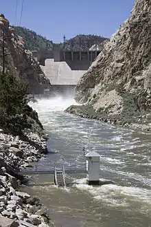 The concrete gravity dam was constructed between 1946 and 1951 by the United States Bureau of Reclamation, with a height of 244 feet, and a length of 440 feet at its crest.[1] It impounds the North Platte River for hydroelectric power. Owned and operated by the Bureau, it stands as part of the Kortes Unit of the vast Pick–Sloan Missouri Basin Program less than two miles downstream from the Bureau's larger Seminoe Dam.