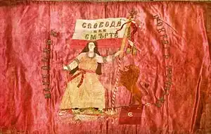In 1902 Rusinska married revolutionary Nikola Rusinski.[2] Rusinski took part in the unsuccessful Ilinden–Preobrazhenie Uprising.[2] During the uprising, Rusinska and three other teachers created the battle flag of the Ohrid IMARO showing a young woman and a lion stepping onto the Ottoman flag and waving a Bulgarian flag with the words "Freedom or Death" in Bulgarian on it. After the unsuccessful uprising, the two were not arrested, but moved to Bulgaria where Rusinska returned to teaching in the village of Skravena. They had three children. The Balkan Wars morphed into the First World War, and whilst her husband volunteered to fight as Bulgarian soldier in the Maleshevo region, she again taught children, this time in Berovo, until 1918.[1]