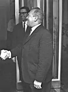Nestoridis scored the first hat-trick in the history of the first division on 6 December 1959 in an away match against Panegialios.[12] On 7 March 1961, the administration of AEK imposed a one-month ban on him, because in the match against Panionios, he showed unsportsmanlike behavior towards his colleagues and the referee, but eventually took back their decision. He is the only player to become the top scorer of the Greek championship five times in a row. He is one of only three players in the history of AEK who managed to score five goals in a single league match which he achieved on 2 June 1963 against Iraklis.[13] He was the scorer of the first goal of AEK in the UEFA competitions, on 18 September 1963 in a heavy 7–2 defeat against Monaco, for the European Cup.[14] Until today he remains one of the club's highest scoring players, widely regarded as one of the greatest players to ever play for the yellow-blacks. He and another legend of AEK, Mimis Papaioannou, formed one of the club's most formidable goalscoring partnerships. In the eight seasons he played for AEK, he was always the top scorer of the team with the exception of 1964, when Papaioannou surpassed him. He had scored 13 times with a direct corner kick, one of them being one of the goals the 3–3 in the play-off match against Panathinaikos on 23 June 1963, which won the title for AEK after 23 years and Nestoridis his only Greek Championship of his career.[15] He also won with AEK a Greek Cup in 1964.[16] In the summer of 1965, Nestoridis took the decision to leave the club, but the possible departure of Papaioannou made him reconsider his decision and stayed to the double-headed eagle for one more season, despite his advanced age.