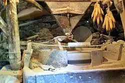 The dry-based fulling mill (in local Macedonian: валајца, valajca) or as well as the water-based fulling mill was built at the beginning of the 20th century. In the beginning of the 2010s, it was in the phase of restoration. The drive part is original and consists of a spindle and on it pegs with fins called kutlici, all made of wood. This part is in a very bad condition and needs to be restored. The interior processing section goes under the owners' house and has been almost entirely restored. Foams are made of wood (in the form of large jagged hammers) that are hung on the part called the old man with the help of beams that are also called needles. There is also a part made of boards called plešti and the lower part is also made of boards – a chest where the folded wool fabric is placed for finishing, i.e. rolling with constant soaking of the fabrics with cold water. The reconstruction was made according to the example of the valavici in the village of Virovo, Demir Hisar Municipality, that is, of the type of dry-based fulling mills with a starec, and not with a loom which was probably more characteristic of this region. Since 2007, restoration has been started. It remained to make a new one or to preserve and rebuild the outer part: the spindle, the peg, the balls and the metal part on which the spindle turns. The dry-based fulling mill was used for finishing the woolen klašna, that is, for refining the coarse woolen fabrics. With the help of the action of water they were washed, dirt and excess grease was removed. The wool fibers spread out, the base is no longer known and the fabric becomes thick, but at the same time it acquires softness, elasticity, even shine.[2]