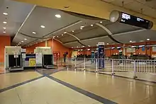 Sultan Ismail Petra Airport (IATA: KBR, ICAO: WMKC) is an airport that operates in Kota Bharu, a city in the state of Kelantan in Malaysia. The airport is named after Ismail Petra of Kelantan, the 28th Sultan of Kelantan, who ruled from 1979 to 2010. The present new terminal was officially opened in September 2002. The 12,000 m2 airport terminal has three aircraft stands, three aerobridges and is able to handle maximum capacity 1.45 million passengers. The airport consists of 9 check-in counters and offers flights between a total of 7 domestic destinations from Malaysia Airlines, AirAsia, Firefly, MYAirline, and Malindo Air. In 2014, this made it the busiest airport in the East Coast.