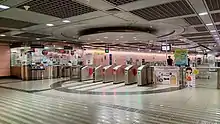 The platforms are wheelchair-accessible. A tactile system, consisting of tiles with rounded or elongated raised studs,[27] guides visually impaired commuters through the station.[28] Dedicated routes connect the station entrances to the platforms or between the lines.[29]