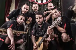 Koza Mostra is a Greek rock band founded in 2011. It consists of Ilias Kozas (lead singer, classical and electric guitar), Dimitris Raptis (drums), Stavros Apostolidis (bouzouki, backing vocals), Giannis Bellos (bass guitar, backing vocals), Tasos Gentzis (saxophone, backing vocals) and Asterios Fragos (electric guitar, backing vocals). The band fuses ska, punk, and rock music together with the style of traditional Greek folk music such as Macedonian Greek music and rebetiko.[1]