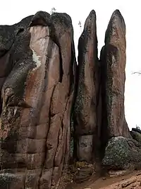 Krasnoyarsk Pillars (also known as Stolby) (Russian: Национа́льный парк «Красноя́рские Столбы́») is a Russian national park located 10 km south of the city of Krasnoyarsk, on the northwestern spurs of the Eastern Sayan Mountains. The site is known for its dramatic rock formations. Over 200,000 climbers, hikers, and other visitors are recorded annually.[1] The park covers 47,219 hectares.