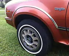 American Motors Corporation (AMC) also used this polymer plastic on the AMC Eagle for the color matched flexible wheel arch flares that flowed into rocker panel extensions.[15][16] This was needed because of the Eagle's 2-inch wider track compared to the AMC Concord platform on which the AWD cars were based on.[17] The Eagle's Kraton bodywork was lightweight, flexible, and did not crack in cold weather as is typical of fiberglass automobile body components.[18]