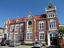 The second landmark is the Church of Saint Bartholomew. The oldest part of the church is the white Renaissance tower from the early 16th century. The neo-Gothic church complex which includes the nave, the rectory and the former convent of the Sisters of the Heart of God (today the town hall), was built at the turn of the 19th and 20th centuries. The church was consecrated in 1896. Near the church there is a baroque sandstone statue of St. John of Nepomuk from 1730.[8]