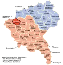 Before the bifurcation of the district in 1887, it had a German majority population. According to the Prussian census of 1860, it had a population of 45,425, of which 34,608 (76.2%) were Germans and 10,817 (23.8%) were Poles.[1] The district population, after the separation of the predominantly German Kreis Schwerin was almost evenly split among Germans and Poles.[1]