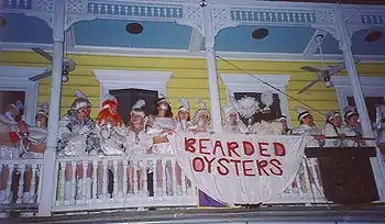 The "Bearded Oysters" dance troupe on a balcony before the start of the parade