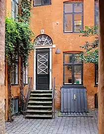 The facade of Gråbrødretorv 17 is finished with shadow joints, a frieze with acanthus ornamentation above the ground floor and a simple cornice below the roof. A golded kringle is seen above the gateway in the right hand side of the building. The windows on the third floor are accented with sills supported by corbels. The pitched red tile roof is pierced by two chimneys, one at each gable. Accress to the main staircase is via an opening in the gateway. The yard side of the building is rendered in a warm orange colour. The side wing consists of two full bays and a canted corner bay. It is topped by a monopitched red tile roof.[34]