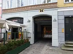 Kringlegangen is a passageway linking the square Gråbrødretorv with the street Valkendorfsgade in the Old Town of Copenhagen, Denmark. A bakery was operated on the site from before 1787 until at least the 1910s. The present building complex (Gråbrødretorv 17/ Valkendorfsgade 32) was constructed in 1856-1857 for master joiner Carl Heinrich Winther. The passageway was not opened to the public until 1975. The name Kringlegangen was inspired by a gilded kringle above the entrance from Gråbrødretorv as well as to the twisting and turning course of the passageway. The entire building complex was listed in the Danish registry of protected buildings and places in 1945.