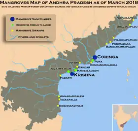 Krishna Wildlife Sanctuary is a wildlife sanctuary and estuary located in Andhra Pradesh, India.[2] It is one of the rarest eco-regions of the world because it harbors vast tracts of pristine mangrove forests. It is believed by conservationists to be one of the last remaining tracts of thick primary mangrove forests of South India, which is rapidly disappearing due to absence of protective measures.[3]