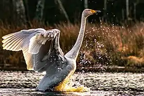 Swan landing on the water, late evening in Kristianstad vattenrike