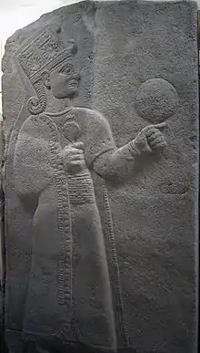As evidenced by art from Carchemish and Arslantepe, Kubaba was depicted seated on a throne, holding a mirror and a pomegranate, with a polos-like crown on her head and a veil placed either over it or on her shoulders.[40] An orthostat belonging to the so-called "Long Wall of Sculpture" in Carchemish, dated to the reign of Suhi II (second half of the tenth century BCE) has been argued to depict Kubaba holding a branch and an object which might be a pomegranate, but as noted by Nicolò Marchetti and Hasan Peker the former would be an unusual attributes for her.[41] However, they do accept that a fragmentary depiction of another goddess belonging to the same set of reliefs can be identified as her.[42] It has been also argued that the relief of a seated goddess holding a mirror from Sam'al is a depiction of Kubaba, though this identification is not based on any inscriptions.[43]