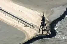The Kugelbake (English: Ball Beacon) is a historic day beacon in the city of Cuxhaven, Germany, at the northernmost point of Lower Saxony, where the River Elbe flows into the North Sea. In the Low German dialect of the Middle Ages, the term bake referred to all navigational aids – including lighthouses. About 30 meters (100 feet) high and built of wood, the Kugelbake is the principal landmark of Cuxhaven; since 1913, it has been depicted on the city's coat of arms. Large wooden structures guiding mariners have stood on this spot for over 300 years.[1][2]