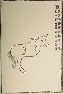 Kuiniu 夔牛 or 犪牛 is an old name for the "wild ox; wild yak". The (1578 CE) Bencao Gangmu[1] entry for maoniu 氂牛 "wild yak", which notes medicinal uses such as yak gallstones for "convulsions and delirium", lists kiuniu as a synonym for weiniu 犩牛, "Larger than a cow. From the hills of Szechuan, weighing several thousand catties." The biological classification Bos grunniens (lit. "grunting ox") corresponds with the roaring Kui "god of rain and thunder" (see the Shanhaijing below).