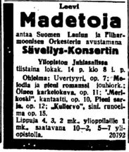 - O. K. [????] (15 October 1913). "Leevi Madetojan sävellyskonsertti" [Leevi Madetoja's composition concert]. Helsingin Sanomat (in Finnish). No. 240. p. 6.