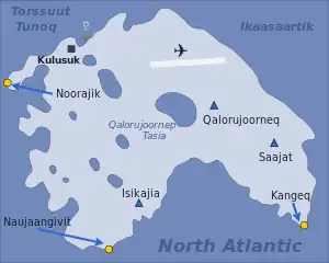 There is one larger lake on the island, Qalorujoornep Tasia, located in a post-glacial cirque in the heart of the island directly west of the western wall of Qalorujoorneq. Its northern shore is situated just shy of the shallow saddle in the northwestern ridge of the mountain, directly above the airport. During the brief summer a stream flows to the west, to then turn north through the depression in the center of the island, to join the second-largest lake on the island, serving as a water reservoir for the settlement.[4] The reservoir empties into a smaller pond on the edge of the village just south of the coastal scarp. The outflow from the reservoir leads to the west, through a series of smaller interior lakes, draining into Tiivtingaleq bay. All lakes and streams are frozen during winter.