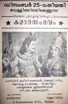 Kumara Sambhavam is a 1969 Indian Malayalam-language Hindu mythological film directed and produced by P. Subramaniam. Based on the epic poem of the poet Kalidasa of the same name, it stars Gemini Ganesan, Padmini, Srividya and Thikkurissy Sukumaran Nair.[1] The film won the first ever Kerala State Film Award for Best Film.[2] The film stood apart in technical quality when compared to previous Malayalam films and is hence regarded as a landmark in the history of Malayalam cinema. It also marked Sridevi's first Malayalam film.[3] The film was dubbed in Tamil under the same title.[4]