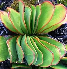 Kumara haemanthifolia is a small bunched plant, related to aloes, with greyish-green, tongue-shaped leaves that grow in a fan shape, similar to its sister species Kumara plicatilis, the fan-aloe. In fact, it looks very much like a diminutive, stemless form of the tree-like Kumara plicatilis. Its compact ranks of leaves are oblong and grey-green in colour, with bright red margins.[4][5]