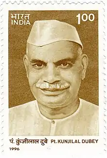 Kunji Lal Dubey (18 March 1896 – 2 June 1970) was an Indian independence activist, lawyer, educationist and politician from Madhya Pradesh.[1] He was the first vice chancellor of Rani Durgavati University and the chancellor of Nagpur University. He served as the first speaker of Madhya Pradesh Legislative Assembly in 1956, as the Finance Minister of the State in 1967 and was the president of the Inter University Board of India, Burma and Ceylon.[2] The Government of India awarded him the third highest civilian honour, the Padma Bhushan, in 1964, for his contributions to the society.[3] India Post issued a commemorative stamp on Dubey in 1996.[4]