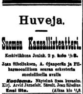 An 1 December 1903 advertisement in Uusi Suometar promoting Sibelius's incidental music to Kuolema
