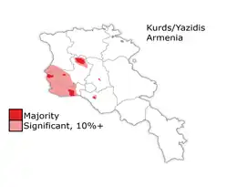 Kurds and Yazidis are counted as separate ethnic groups in Armenia (on the relationship between Yazidis and Kurdish identity, see Yazidis#Identity). The latest census conducted in Armenia (2011) recorded 35,308 Yazidi and 2,162 Kurdish inhabitants of Armenia based on the self-identification of the respondents.[1] Practically all of those who identified themselves as Kurds in the census are members of the Yazidi community who embrace a Kurdish identity; extremely few Muslim Kurds live in Armenia today.[4][5]