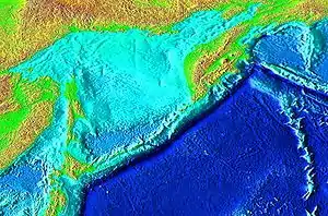 The Kuril–Kamchatka Trench or Kuril Trench (Russian: Курило-Камчатский жёлоб, Kurilo-Kamchatskii Zhyolob) is an oceanic trench in the northwest Pacific Ocean. It lies off the southeast coast of Kamchatka and parallels the Kuril Island chain to meet the Japan Trench east of Hokkaido. It extends from a triple junction with the Ulakhan Fault and the Aleutian Trench near the Commander Islands, Russia, in the northeast, to the intersection with the Japan Trench in the southwest.[1]