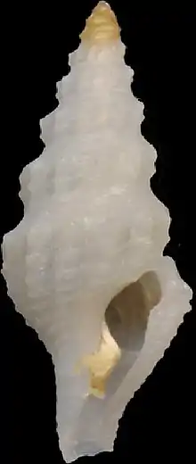 (Original description) The pale buff shell is high, narrow and has a conical, shape. It has a small apex, a contracted, conical base, and a longish narrow aperture. It is carinated, ribbed, with spiral threads