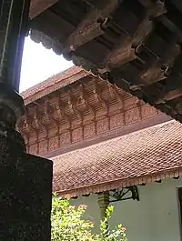 Built in the 1840s, Kuthiramalika is an example of traditional Kerala architecture, with its typical sloping roofs, overhanging eaves, pillared verandahs and enclosed courtyards. Intricate carvings adorn the wooden ceilings, with each room having a distinctive pattern. The construction of the palace was completed by 5000 Vishwakarmas in four years. The palace is made from teakwood, rosewood, marble, and granite.[2] The roof of the palace is made of wood and 42 beams support the carved patterns.[3] The roof is supported by granite pillars. Floral motifs dot the ceiling of the verandah.[3] The main 16 rooms of the palace are constructed in 16 different patterns.[3] In all, the palace contains 80 rooms, of which 20 were opened for visitors in 1995.[2] The floor inside the palace is made of egg whites, charcoal, and limestone, which make it cold and smooth even in hot weather conditions.[2] The concert venue built in the palace premises uses traditional sound reflectors comprising fifty clay pots hung upside down from the ceiling.[4]