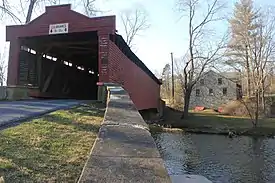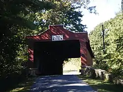 Built in 1854, this historic structure is a 93-foot-long (28 m), Burr Truss bridge that crosses the Sacony Creek. It is one of five covered bridges remaining in Berks County.[2] As the name implies, it leads to the Kutz Mill.
