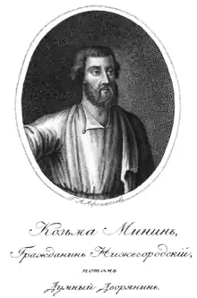 Kuzma Minin (Russian: Кузьма́ Ми́нин), full name Kuzma Minich Zakhariev-Sukhoruky (Russian: Кузьма́ Ми́нич Заха́рьев Сухору́кий; c. 1570s – May 21, 1616), was a Russian merchant who, together with Prince Dmitry Pozharsky, organized a people's militia in Nizhny Novgorod to oust the Poles from Moscow in 1612.[1][2][3][4][5] As a result, they became national heroes for their role in defending the country.