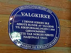 In 1814, this church served as an election church (Norwegian: valgkirke).[5][6] Together with more than 300 other parish churches across Norway, it was a polling station for elections to the 1814 Norwegian Constituent Assembly which wrote the Constitution of Norway. This was Norway's first national elections. Each church parish was a constituency that elected people called "electors" who later met together in each county to elect the representatives for the assembly that was to meet in Eidsvoll later that year.[5][7]