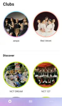 Screenshot ![]() Screenshot of the Clubs tab showing Aespa and Red Velvet as clubs already joined by the user, with NCT Dream and NCT 127 shown on the Discover section of the tab | |