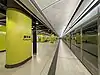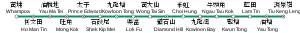 The Kwun Tong line (Chinese: 觀塘綫) is a rapid transit line of the MTR network in Hong Kong, coloured green on the MTR map. Starting at Whampoa in Hung Hom and ending at Tiu Keng Leng in Tseung Kwan O, Sai Kung, the route has 17 stations and takes 35 minutes to complete.[3] The Kwun Tong line is one of the busiest railway lines on the network connecting the central and the eastern portions of Kowloon via Wong Tai Sin. The line is mostly underground, but includes a lengthy elevated section, and runs generally in an east-west direction. During the morning rush hour, the Kwun Tong line utilises 33 trains running at 29tph (trains per hour) to achieve a route capacity of 85,000 pphpd.[3]
