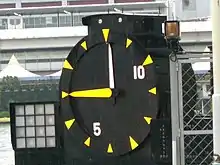 Kyōtei employs the flying start system of beginning races. Once competitors receive the signal to pit-out of the docks, they will maneuver their boats in an effort to secure a starting position while a large clock situated at the start/finish line begins a one-minute countdown. Starting positions are usually established with 30 seconds before the clock reaches zero, and with about 12 seconds remaining the boats begin to race up towards the start line at full speed.[4] Boats must cross the start line within one second after the clock reaches zero. Unlike typical powerboat racing, where if a boat crosses the line too early, there is a time penalty added to the offending boat, in Kyōtei, a false start (フライングスタート, furaingu sutāto, "Flying Start") or crosses too late - called a "Late Start" (出遅れ, deokure), will disqualify the boat, where it is scratched from the race and bets on that boat are refunded.[3] The Japanese term for this exclusion is "return absence" (返還欠場, henkan ketsujō). In a sense, the flying start system can be compared to the mobile start used in harness racing.