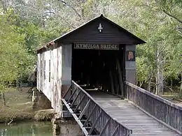 The Kymulga Covered Bridge is a wood & metal combination style covered bridge that spans Talladega Creek, located just east of Kymulga Mill within Kymulga Park. Built in 1861, the 105-foot (32 m) bridge is a Howe truss construction over a single span.[5] The Kymulga Covered Bridge is one of two 19th-century covered bridges extant in Alabama still remaining at its original location; the Waldo Covered Bridge, also located in Talladega County, is the other.