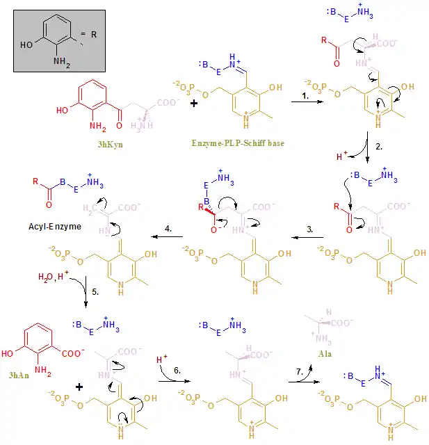 In KYNU reaction, PLP facilitates Cβ-Cγ bond cleavage. The reaction follows the same steps as the transamination reaction but does not hydrolyze the tautomerized Schiff base. The proposed reaction mechanism involves an attack of an enzyme nucleophile on the carbonyl carbon (Cγ) of the tautomerized 3hKyn-PLP Schiff base. This is followed by Cβ-Cγ bond cleavage to generate an acyl-enzyme intermediate together with a tautomerized Ala-PLP adduct. Hydrolysis of the acyl-enzyme then yields 3hAnt.